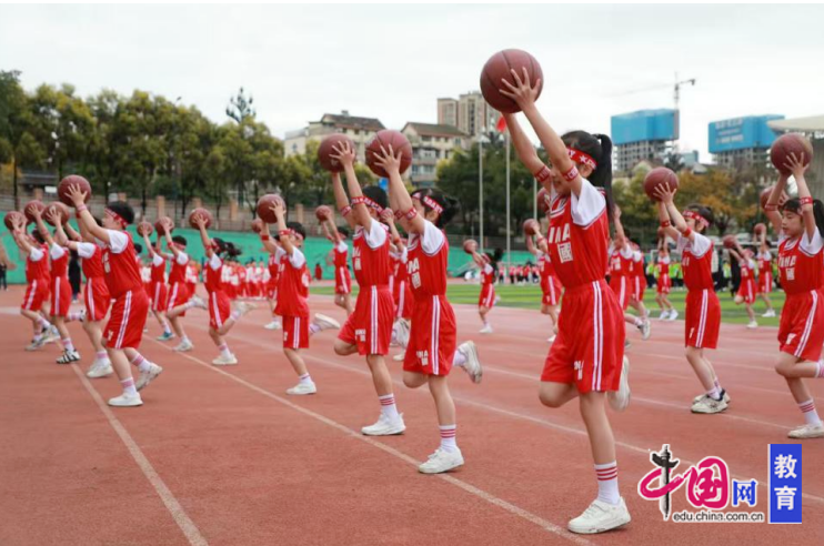 开幕式精彩纷呈,尽显中山少年无限风采。A、B两校区联动展演,氛围热烈高涨。四年级《阳光下成长》团体操与五年级旗舞《舞动旗帜 悦动成长》精彩亮相,生动展现学校“一校一品”办学特色。依托全国“网球示范校”“篮球特色示范校”“足球示范校”优势,学校还精心呈现一年级及社团同学的网球表演、二年级足球操、三年级篮球与武术展示,构建起多元融合的运动教育矩阵。从彩旗队、鲜花队到各年级方阵依次入场,再到师生大课间跑操《一起向未来》,活动打造“特色定制+传统文化”相融合的立体化运动场景,既彰显地域文化与学校特色,也凝聚起团队协作的育人合力。